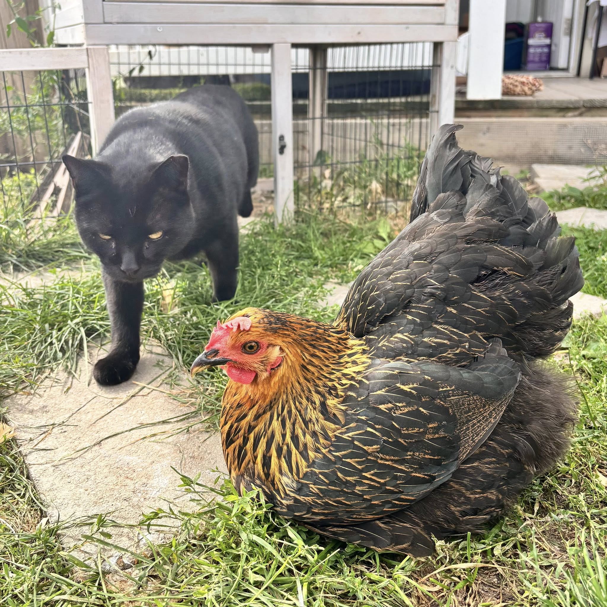 We introduced Woody and Juno late fall, and it was NOT love at first sight. Juno hung out in a wire crate just outside Woody’s run so they could look but not touch. Woody was moderately interested and Juno acted like she wanted to get to know him. After a few days of talking through the fence, we put them together and Juno immediately attacked him. Because chicken social rules are different than human rules, we wanted to keep trying. And luckily after a little more time on opposite sides of the fence, their second meeting went a lot better.