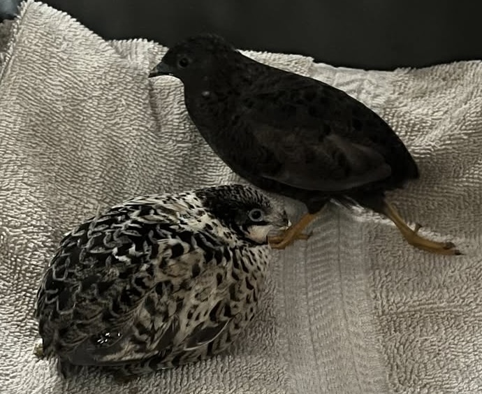 Since Buttons’ break, both quail are being kept in a small crate together to minimize movement and maximize healing potential. They are constantly sitting right next to one another, and it’s clear that both their lives are better with the other in it. We have decided that if amputation is right for Buttons, we’re going to give Zipper the same chance. They are our only two quail of this size, and they are better together.