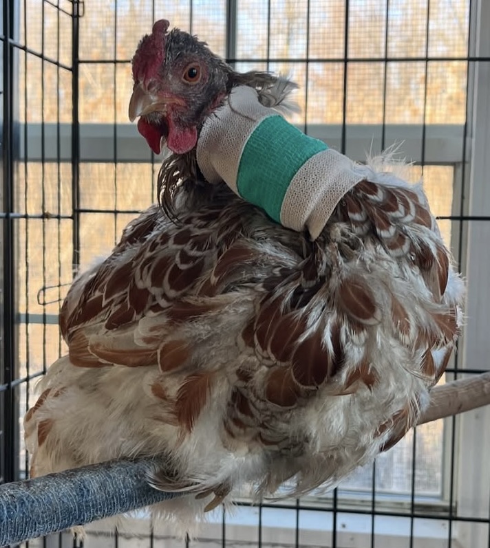 Long story short, she had a fractured pelvis, and a large tear on her side that required nearly twenty staples. She had to be tube fed and medicated for weeks, and it was over a month before she even tried to walk again. But she recovered beautifully, and outside of having a little lean to her, she became a normal chicken. She joined a flock with our tiniest rooster and had 2 1/2 good years with us.