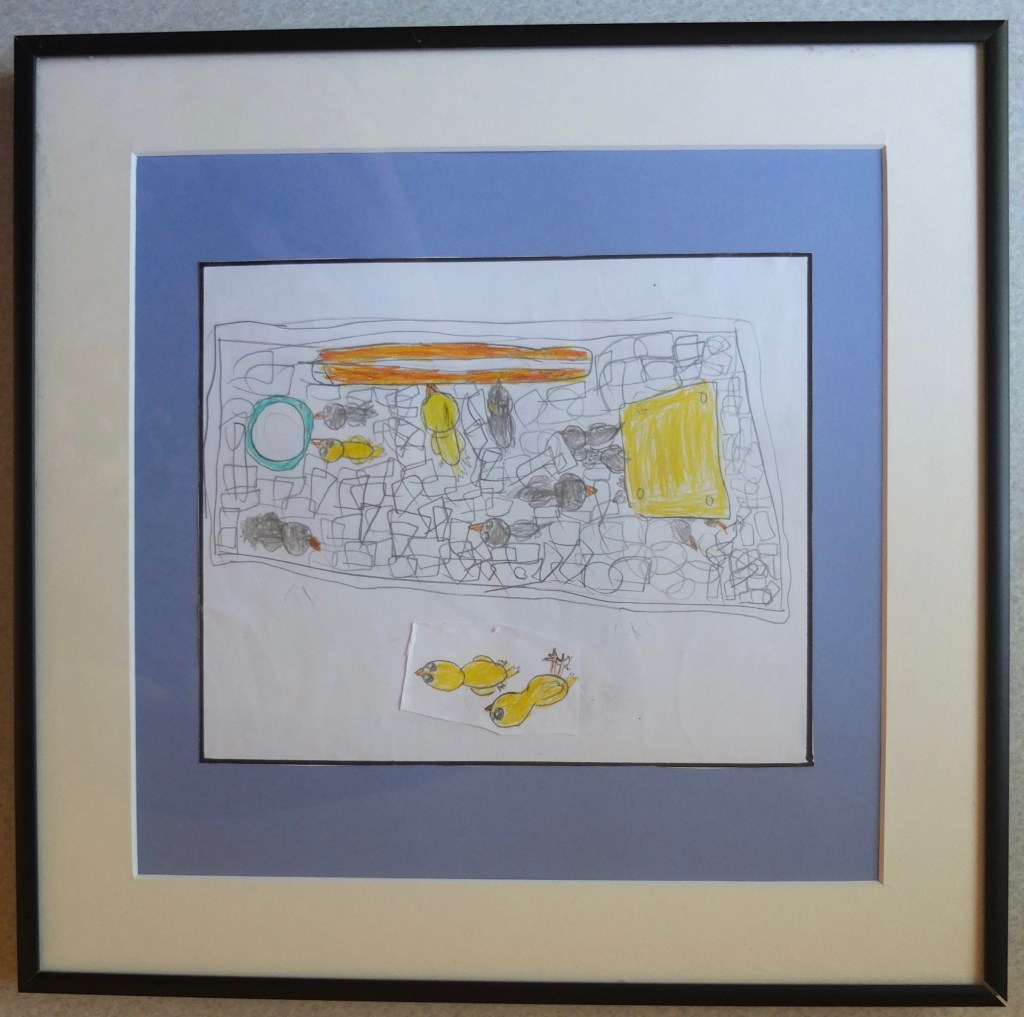 In the summer of 2018, I got some thank you notes and drawings from a class of five and six year olds. My favourite came from a budding Picasso. It was the only illustration not accompanied by a letter. Later, the teacher informed me that the little boy who drew it didn’t speak English, but wanted to give me something to show what the chicks meant to him. I wondered if the two chicks at the bottom were ones from their ‘eggtopsy’ lesson – examining unhatched eggs to see what might have happened. I liked it so much my partner framed it for me.