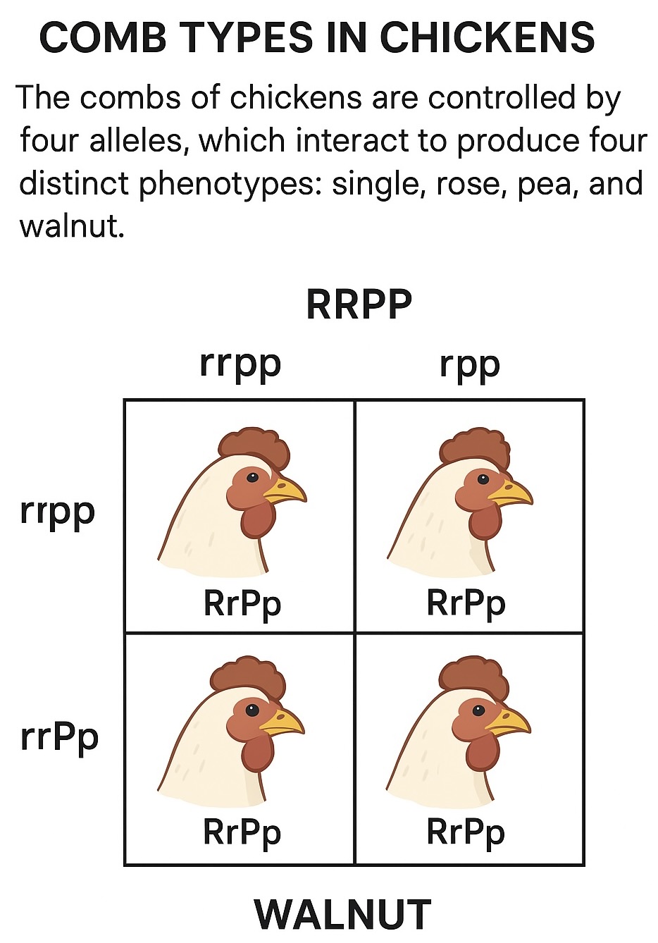 Combs are controlled by four alleles, which interact to produce four distinct phenotypes: single, rose, pea, and walnut.