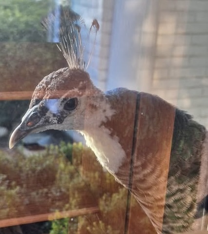 Long story short. A peahen moved into our yard this past August during a monsoon storm. She hasn’t left. No one has claimed her. I’ve called every bird rescue, Game and Fish, and told every time, “It’s someone’s missing pet”. Posted in NextDoor app. Needless to say, we are now privileged to take care of her. She is Becky with the good hair. It’s still odd and wonderful to see her spying on us through the window. Every sunset she makes her way into our huge tree, settles for down the night and at sunrise, wakes up and repeats the day. I’ve learned more about peahens than I ever thought I’d need. Life is interesting! – View From My Window
