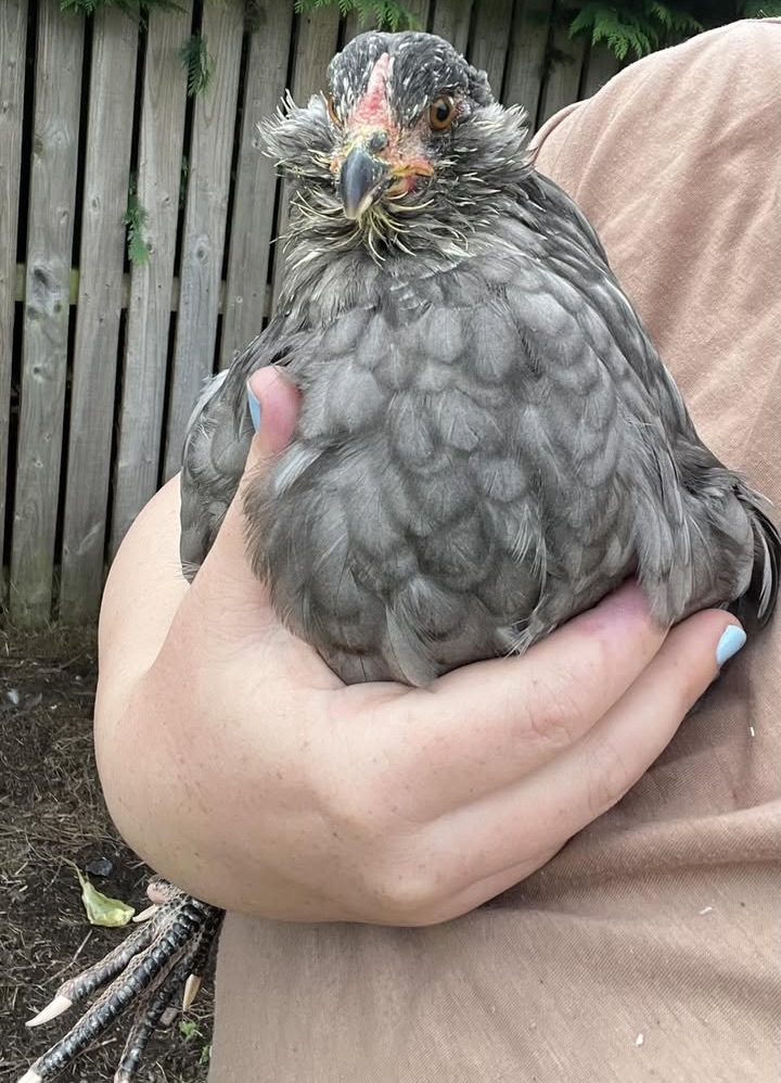 I did a headcount today and realized my favourite chicken had disappeared so I walked my 1/4 acre property three times in the pouring UK rain when it was pitch black at 7:45pm. I couldn’t find any evidence of a fight. I gave her sisters a good telling off for “abandoning your sister while you all perched on judgment tree” when I heard a chirp. I checked the hut and had the urge to look up. How did my hen get 6′ off the ground to roost on a 8’ tall hut? I had to convince/argue with her to get on a plank of wood so I could get her inside the coop where it was dry and warmer. She didn’t make it easy and since I’m 5’5 I didn’t have much luck at first. I finally caught her and forced her to cuddle with me to settle my nervous heart. I’ll admit she cussed me out in clucks. Her sisters faced my judgment when I helped her perch. – Anonymous
