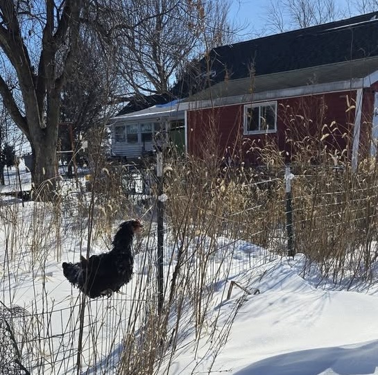 My hen thought she’d hatch some eggs in January. She got buried under a 2’ snowdrift. I think the eggs are still good after packing straw around her prior to the storm. I had to dig her out so she can continue to amaze and thrive! – Martha Temple