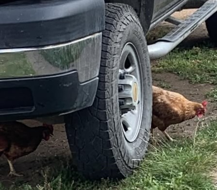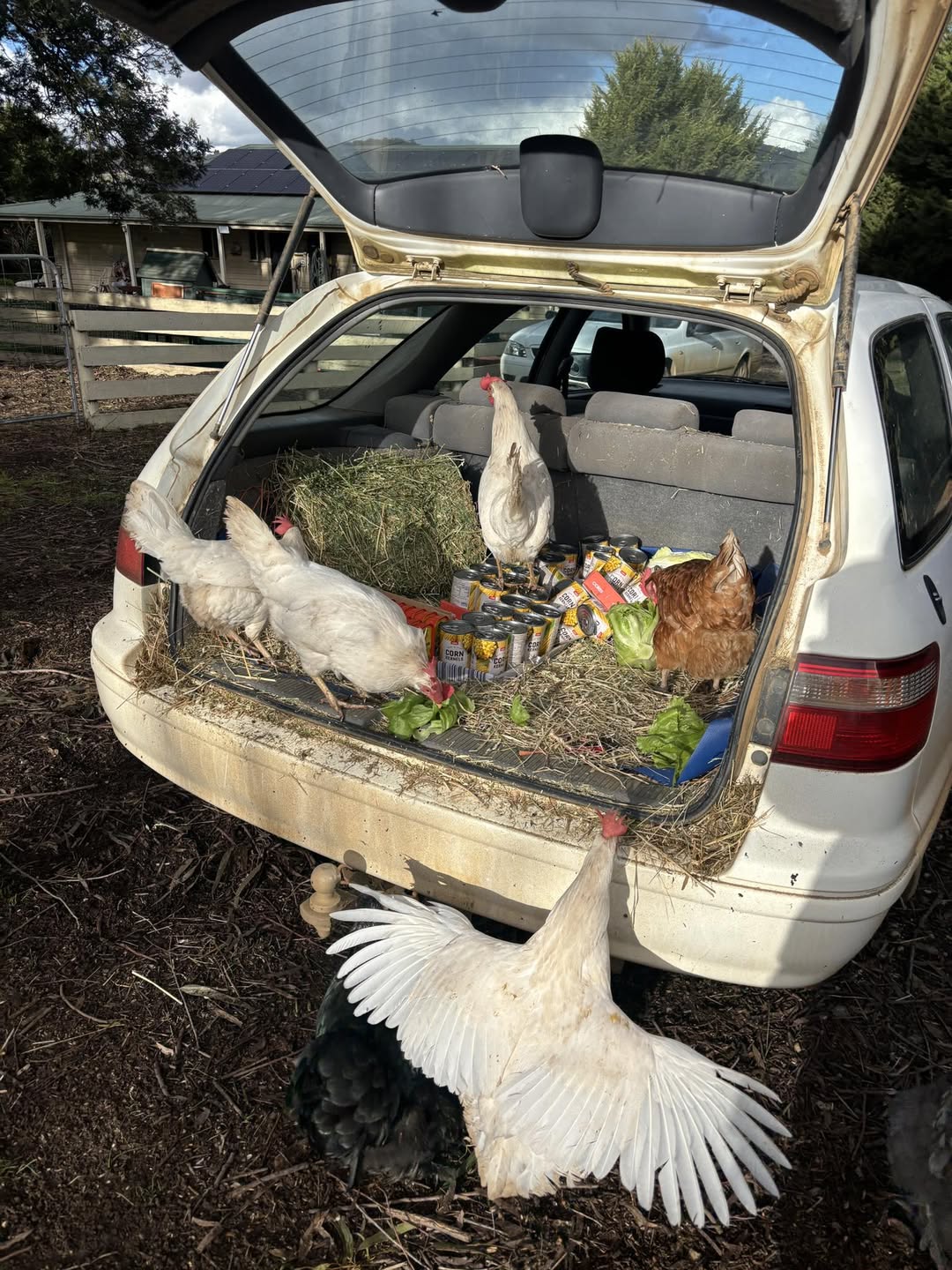 I turned around for 11 seconds and Team Leghorn were on the job cleaning out my car. -Lefty’s Place Farm Sanctuary