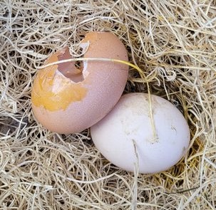 Egg eating is a behaviour you’ll want to prevent, or at least, nip in the bud before it becomes an entrenched bad habit. In my experience it usually starts as a result of when an egg get accidentally broken and then, a curious hen pecks and develops a taste for it. Who would blame her? Eggs are full of tasty protein and vitamins and their shells are a good source of calcium. Chickens play follow-the-leader and often join in on the action of sampling broken eggs.
