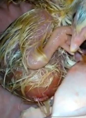The growth of a chick begins in the small fertilized area at the top of the yolk. A network of blood vessels begins to develop spreading from the embryo out over the yolk. The yolk sac is attached to the chick’s navel and the chick draws nourishment from it, producing an enzyme that changes the yolk material so that it can be used as a food by the developing embryo. As the chick hatches any remaining unused yolk is drawn into the chick’s abdomen or navel. It will supply nourishment for the chick’s first few days after hatching. Occasionally issues involving the navel can turn deadly.